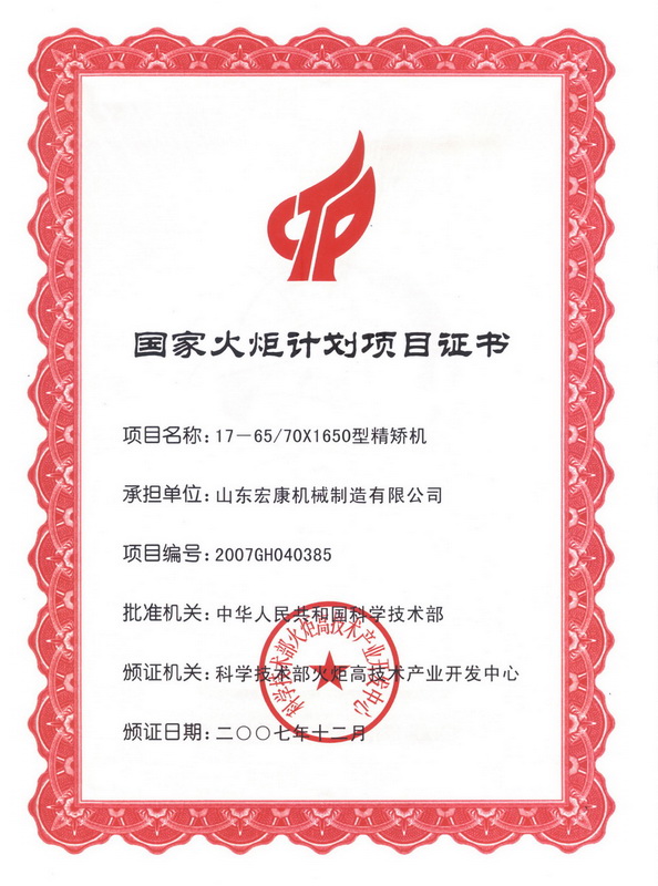 國家火炬計劃項目證書